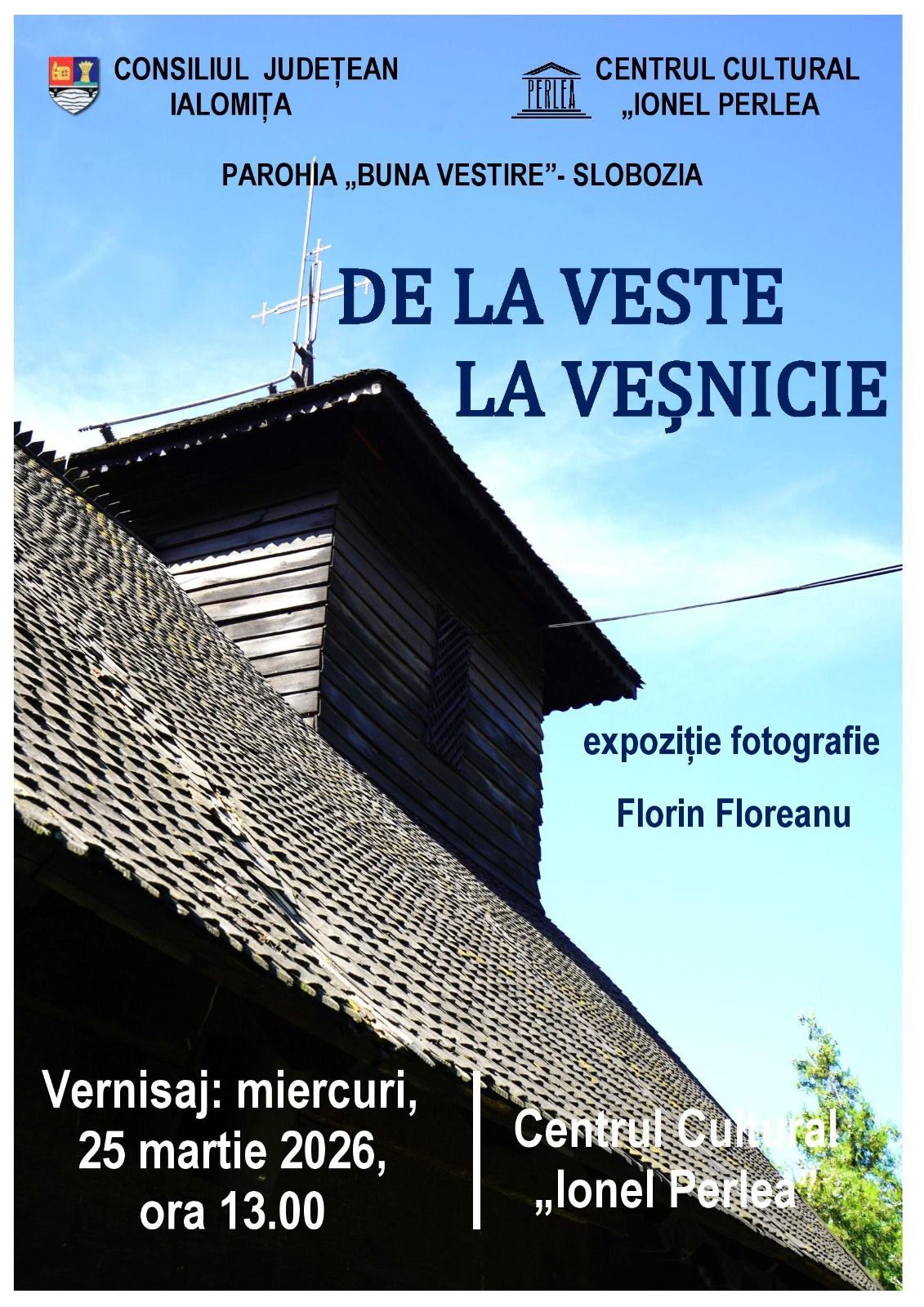 Centrul Cultural „Ionel Perlea” Ialomița, în parteneriat cu Consiliul Județean Ialomița și Parohia „Buna Vestire” din Slobozia, are onoarea de a vă invita la un eveniment cultural deosebit: vernisajul expoziției de fotografie semnată de Florin Floreanu, intitulată sugestiv „De la Veste la Veșnicie”.
